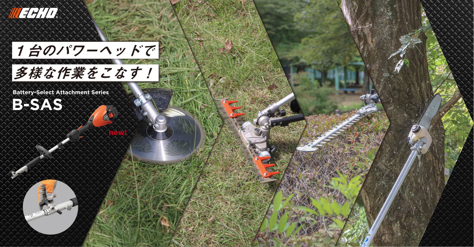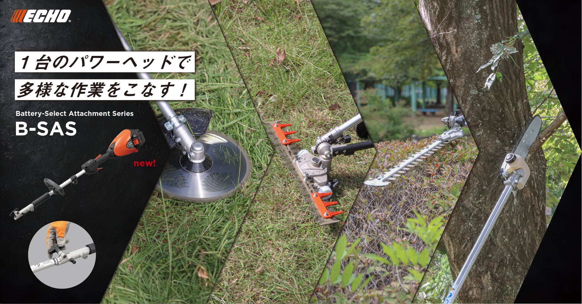 エンジンツールの力強さを受け継ぎ、機動力を進化させたECHO50Vシリーズにバッテリーセレクトアタッチメントシリーズ B-SASが登場。