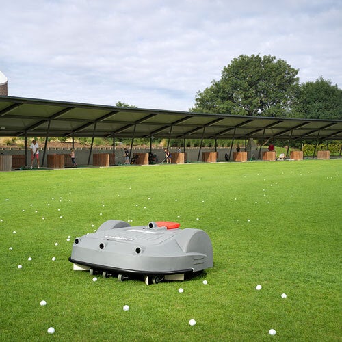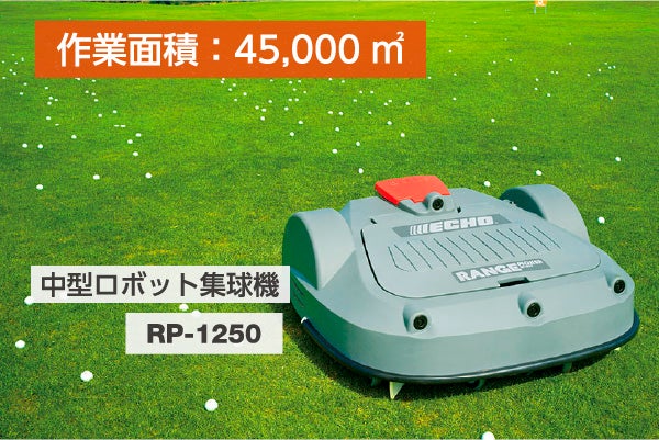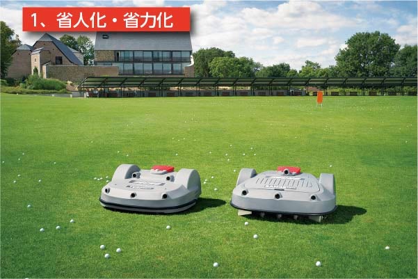 75,000m²(TM-2050)の広大な面積を全自動で芝刈りする「大型ロボット芝刈機」により、芝刈り作業の省人化・省力化が図れます。また、45,000m²(RP-1250)の広域をカバーする自動集球ロボットもロボット芝刈機と併用できるので、フェアウェイだけでなく、練習場の省人・省力化も図れます。