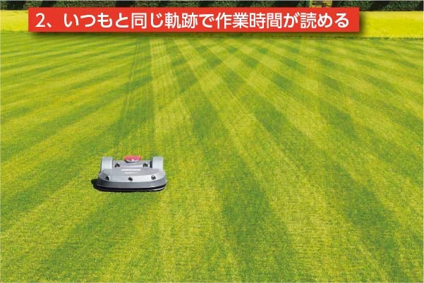 RTKモデルは、同じ時間に同じ軌跡を通って芝刈り作業を行う「パターン走行」を採用しているので、芝刈り作業の時間を読むことが可能です。ですので、施肥や散水、エアレーションなどの芝管理に必要な作業時間を先読みすることで、芝生のメンテナンスがスムーズに行えます。