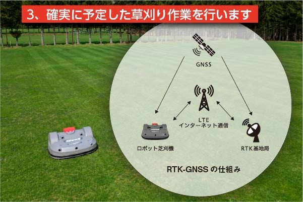 独自のRTK基地局を設置することで、衛星からの情報を確実にキャッチします。山間などの入り組んだ地形でも、ロボットの位置を見失うことなく、芝刈り作業を行います。また、ワイヤーが不要なので、エリア設定がタブレット上で行えるので、障害物の回避設定が簡単に行えます。