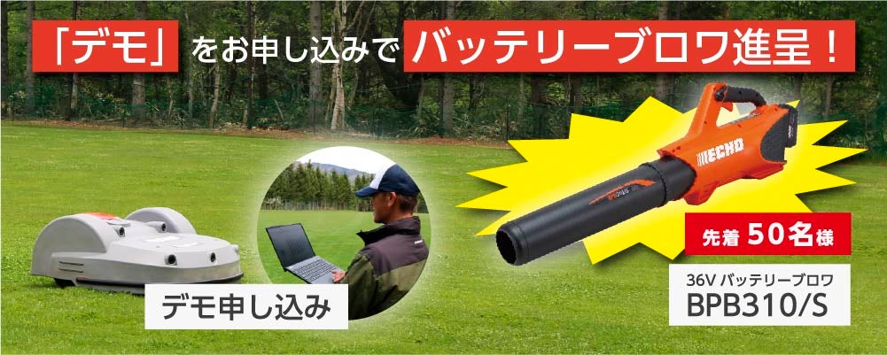 ロボット芝刈機とロボット集球機のデモンストレーションを体験できるキャンペーンを実施中!期間中にデモをお申し込みいただいたお客様 先着50名様に「36Vバッテリーブロワ」を1台進呈いたします。この機会をお見逃しなく!