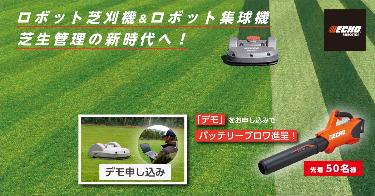 広いエリアを無人で芝刈りすることで、省人化・省力化に大きく貢献するエコーロボティクスの大型ロボット芝刈り機。今回、RTKモデルの登場により、衛星を用いることでワイヤーの埋設を不要とし、複雑な地形も簡単にエリア設定をすることが可能となりました。さらに、決まった場所を決まった時間に同じ軌跡で作業する、「パターン走行」での走行を行うことで、作業のマネージメントが劇的に改善します。そんな、ロボット芝刈り機とロボット集球機のデモンストレーションを体験できるキャンペーンを実施中!期間中にデモを申し込みいただいたお客様先着50名様に、36Vバッテリーブロワを1台進呈いたします。