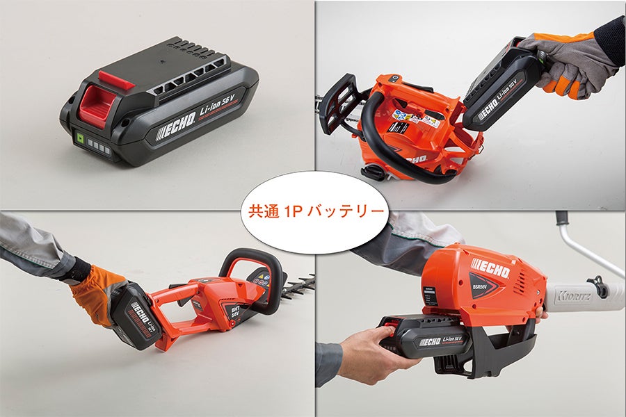 軽量・コンパクトな1Pバッテリーを採用。インフォメーションパネルを搭載した急速充電器により、約42分で満充電が可能です。1Pバッテリーには「残量表示機能」が装備されているので、バッテリー 残量をいつでもチェックできます。また、刈払機・ヘッジトリマーにも装着が可能。ツールを選ばず使えるため、作業の幅が広がります。