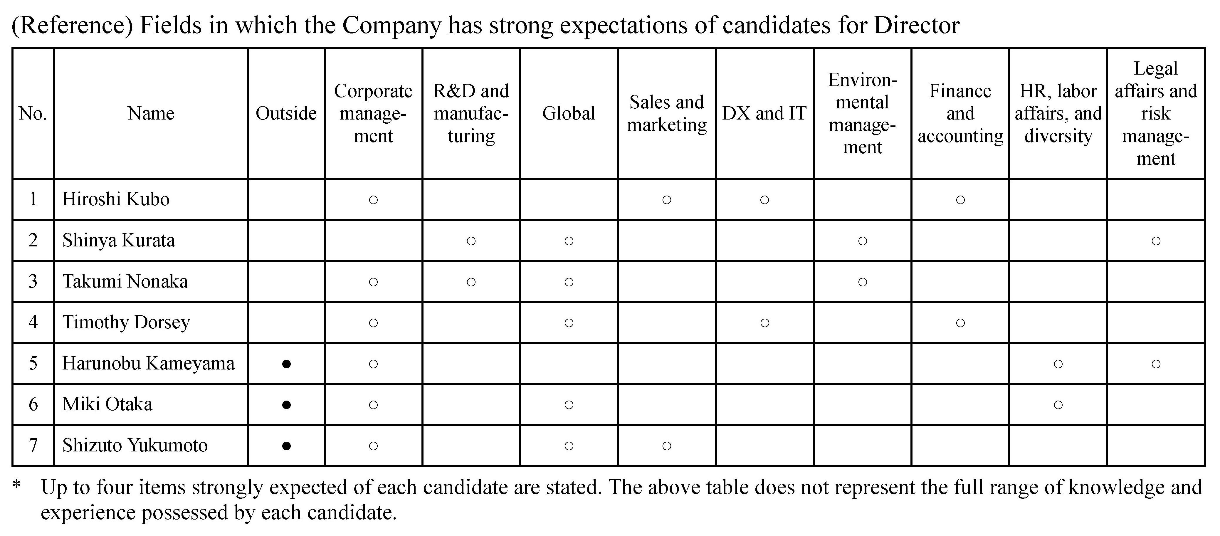 We believe that for the Board of Directors to actively consider and determine Yamabiko Group business management, including globally, from diversified viewpoints, it is important for the Board to consist of diverse directors with different expert knowledge and professional experience and for the balance of knowledge, experience and abilities across the entire Board of Directors to be suitably maintained. We have prepared the skill matrix below showing the knowledge and experience each director possesses, for your reference.