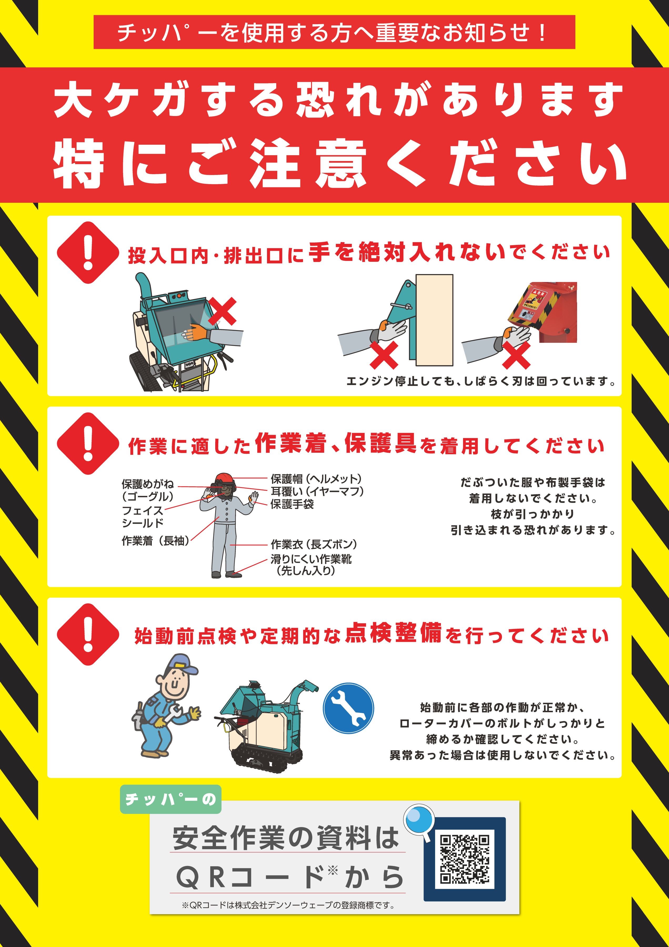 チッパー使用中の重大事故を防ぐためのポイントをまとめました。最も事故の多い 「手の巻き込まれ」や「飛散物」 に注意して、正しい使用方法で作業を行ってください。