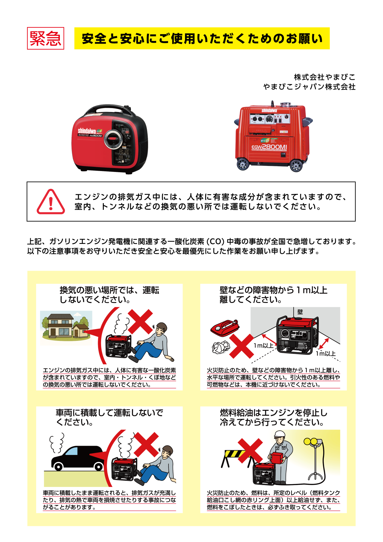 ・喚起の悪い場所(室内、車内、倉庫、トンネル、井戸、船倉、タンク内など)では、絶対に運転しないでください。排気ガスには人体に有害な一酸化炭素が含まれています。無色・無臭で気づきにくく、吸い込むと中毒を起こし、命を落とす恐れがあります。