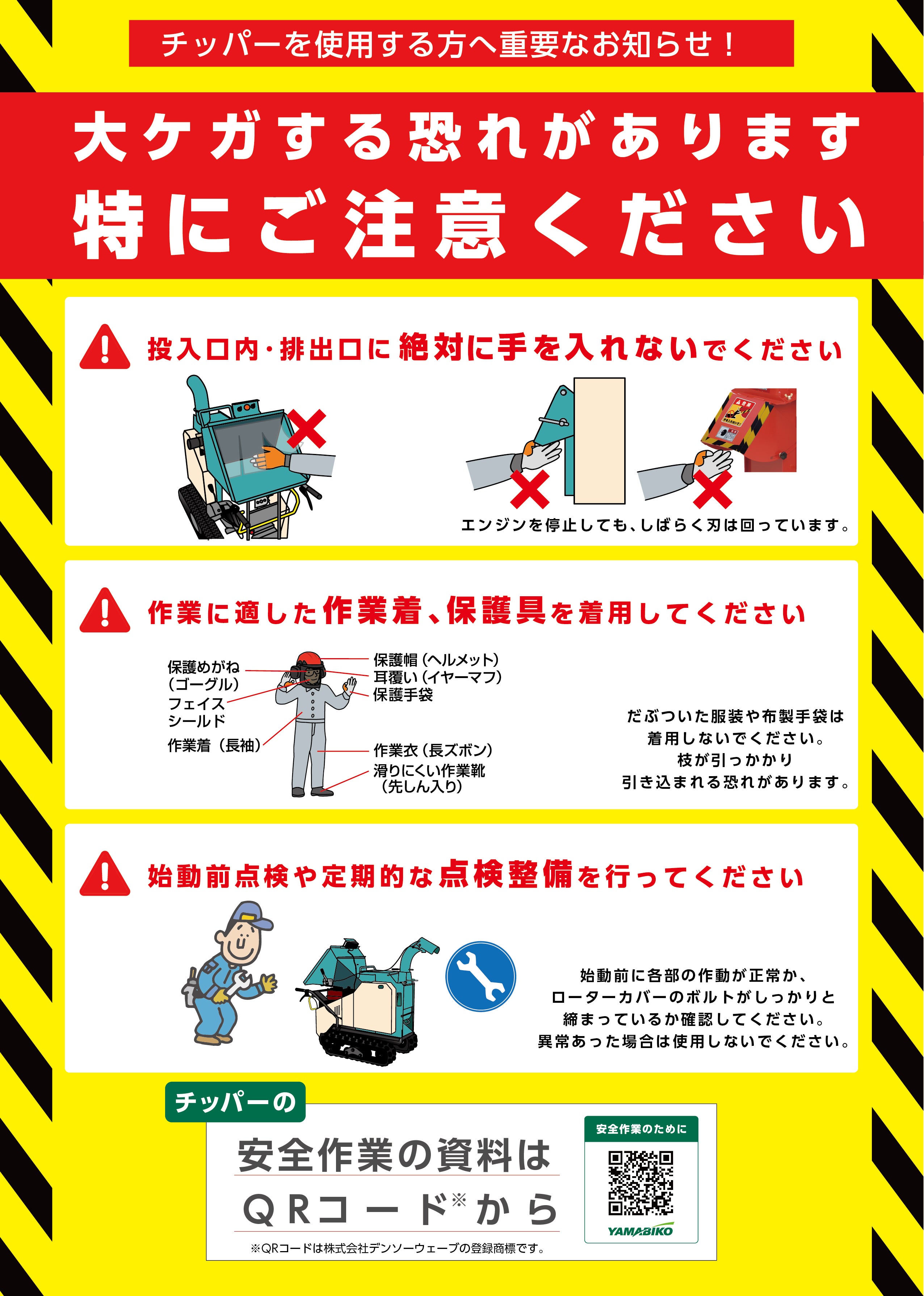 チッパー使用中の重大事故を防ぐためのポイントをまとめました。最も事故の多い 「手の巻き込まれ」や「飛散物」 に注意して、正しい使用方法で作業を行ってください。