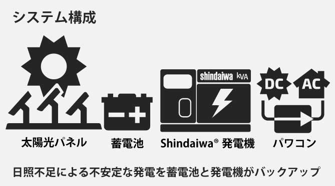 太陽光発電の電力をメインに使用しながら、悪天候等の不安定な発電は蓄電池と発電機がバックアップするフェーズフリーな電力供給システムです。